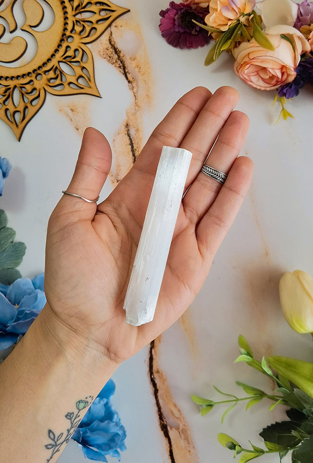 La Selenita calma la mente, purifica los pensamientos, brinda calma, es ideal para hacer barridos de descarga de energía negativa y también se utiliza para purificar otros cristales.