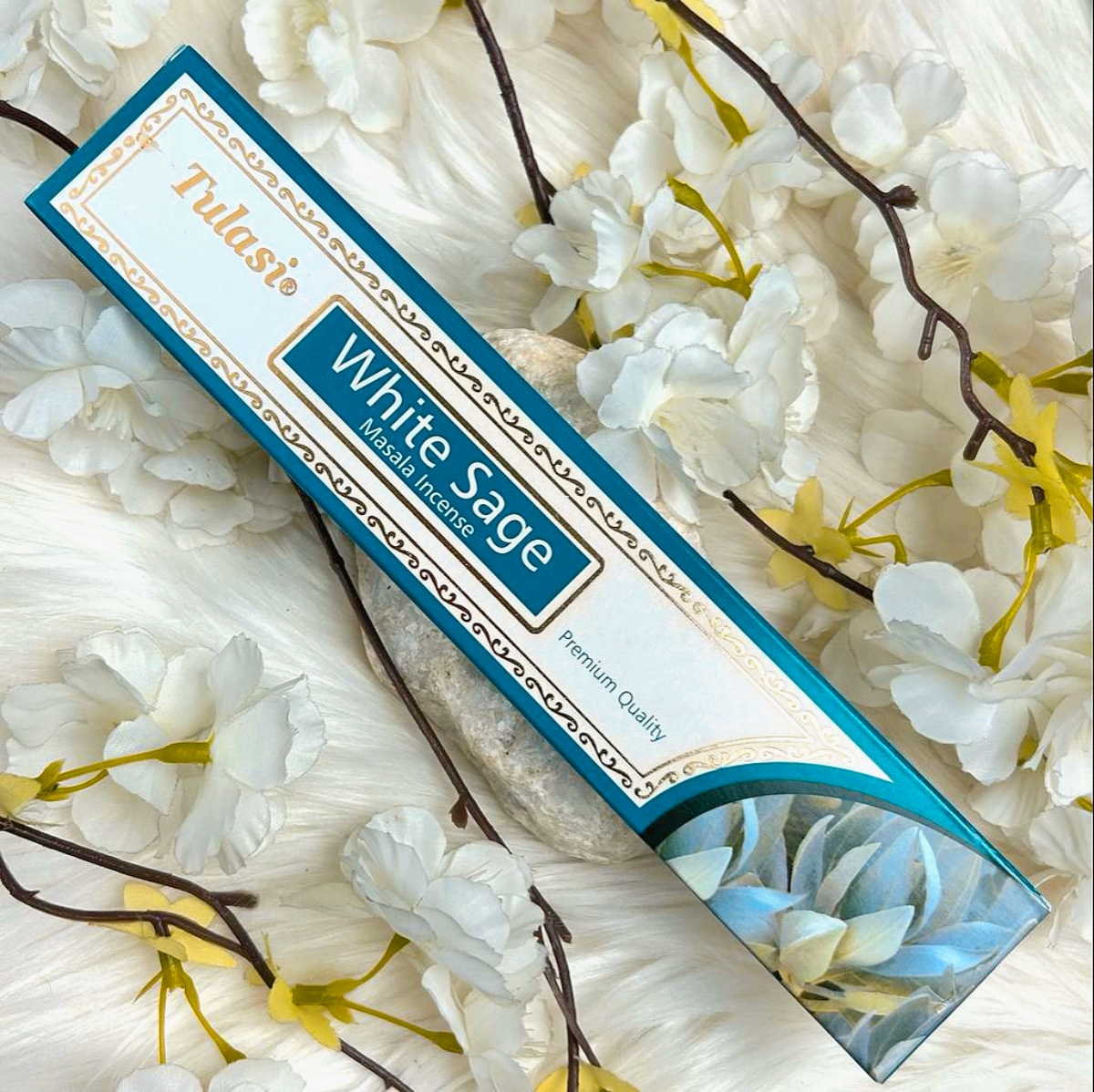 Incienso elaborado a mano con resinas naturales y aceites esenciales de flores Champaka y Salvia Blanca.