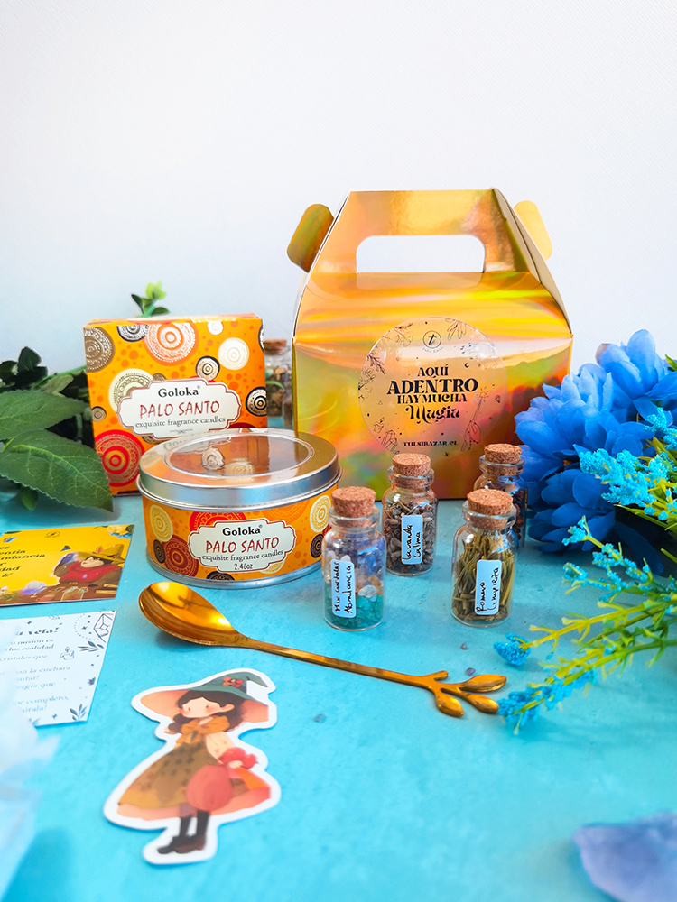 Kit especial para interactuar con la magia de las velas, cristales y amuletos de hierbas, llenos de energía bonita.
