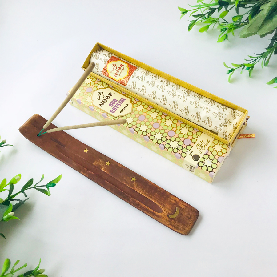 Incienso artesanal de India a base de aceite esencial de Oud, cuyo extracto es extremadamente raro y precioso, el cual se encuentra en la madera de agar; mezclado con toques orquídea, lilas, jazmín y musk.