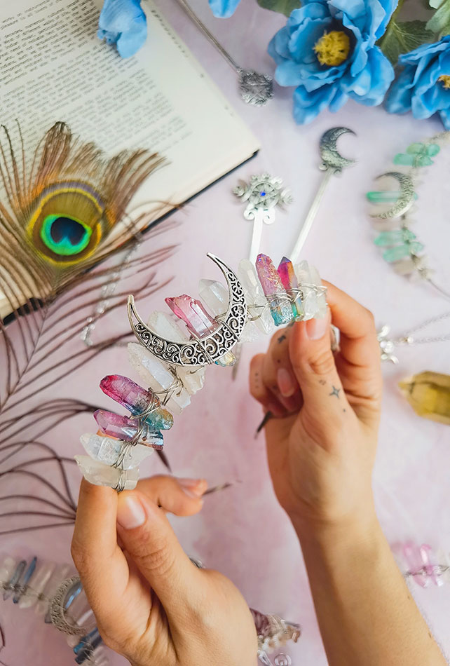 Las Tiaras de cuarzo son una manera muy mágica de conectar con la energía de los cristales. Especialmente el cuarzo es un cristal que conecta con el Chakra de la Coronilla, por lo tanto, calma la mente, brinda claridad y conecta con la energía espiritual.