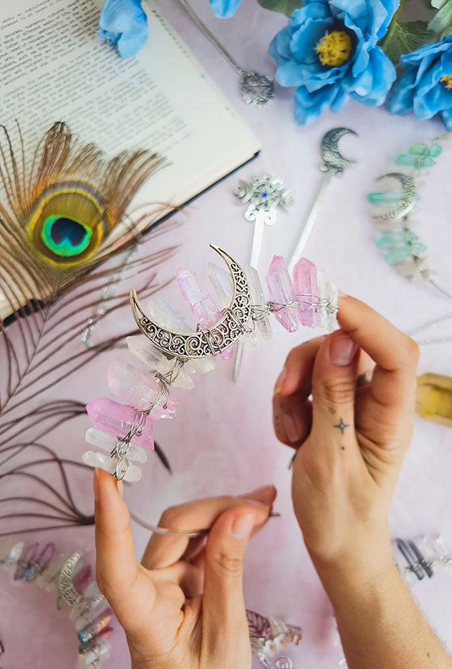 Las Tiaras de cuarzo son una manera muy mágica de conectar con la energía de los cristales. Especialmente el cuarzo es un cristal que conecta con el Chakra de la Coronilla, por lo tanto, calma la mente, brinda claridad y conecta con la energía espiritual.
