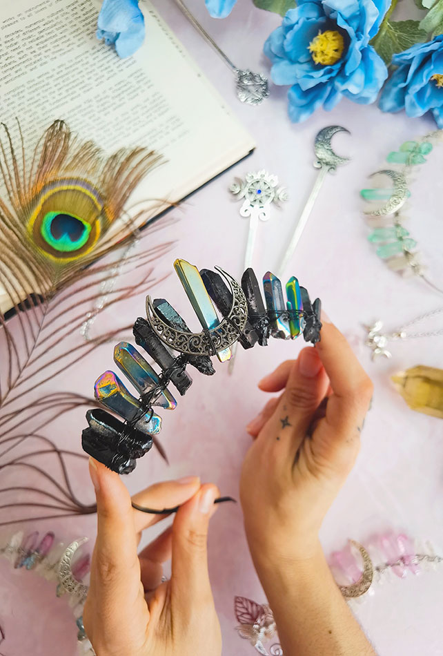 Las Tiaras de cuarzo son una manera muy mágica de conectar con la energía de los cristales. El cuarzo es un cristal que conecta con el Chakra de la Coronilla, por lo tanto, calma la mente, brinda protección y conecta con la energía espiritual.