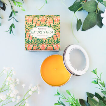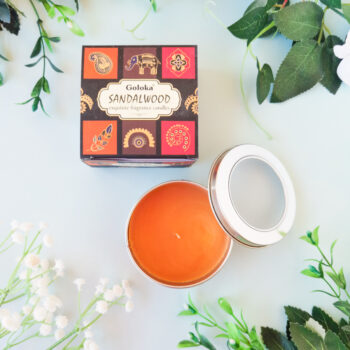 Vela aromática artesanal de soya, elaborada en India a base de esencias naturales y con cristales para intencionar energía positiva.